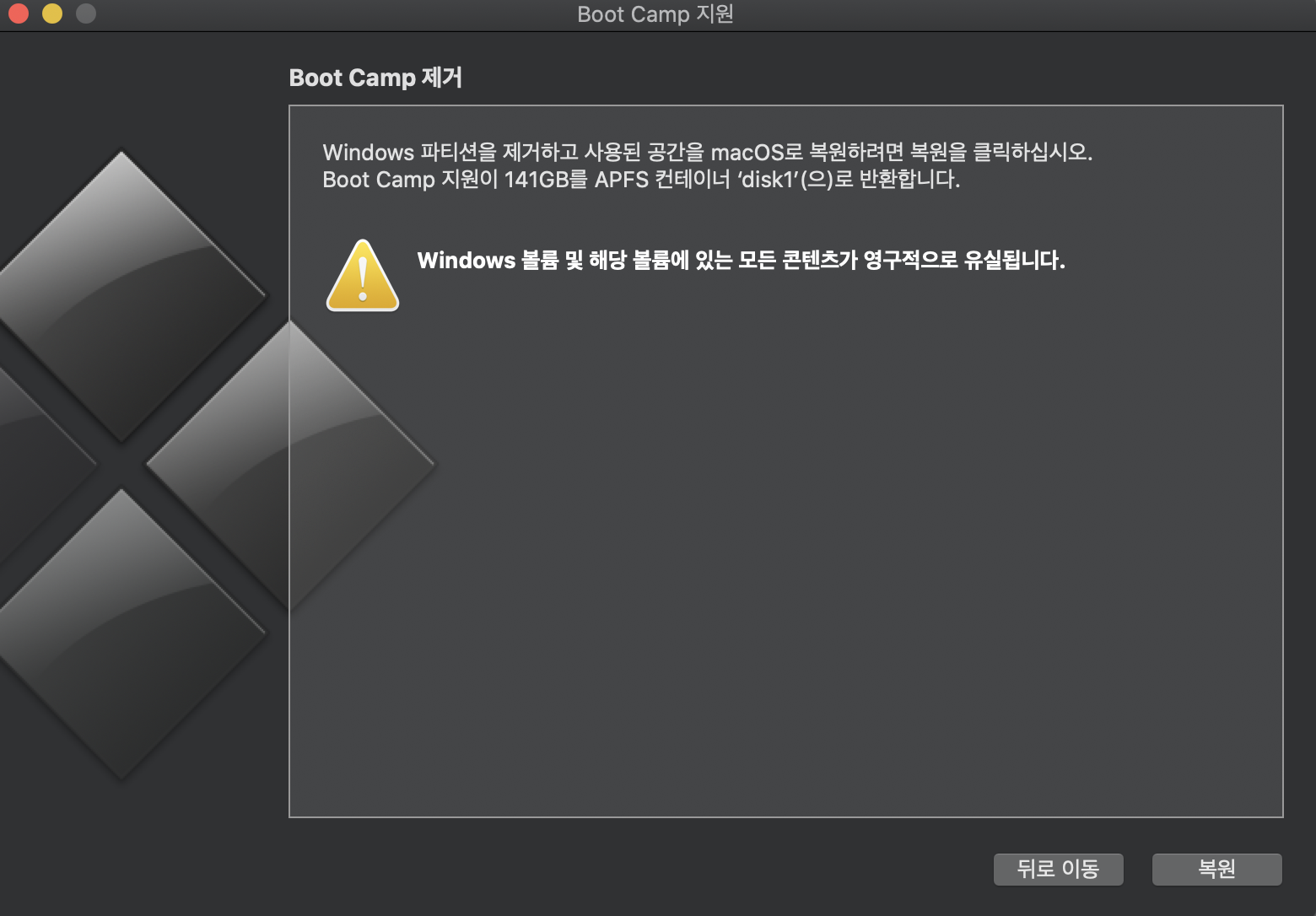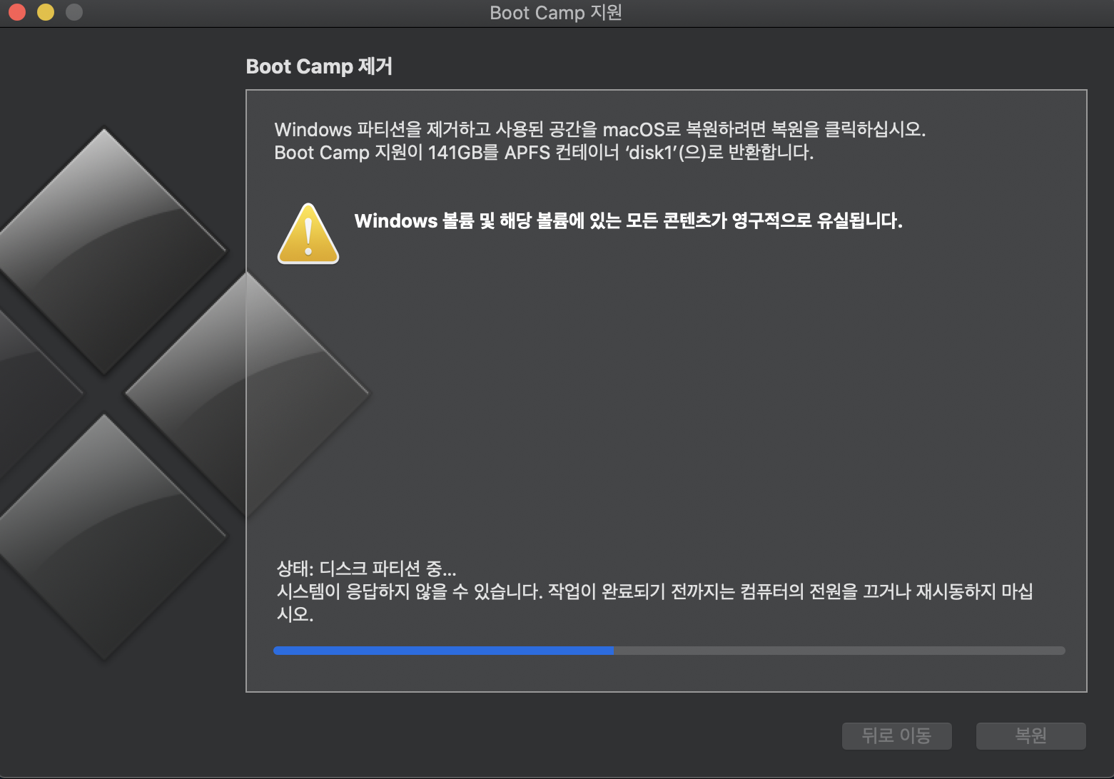 ์๋์ฐ์ฆ ์ด์์ฒด์ ์ค์นํ ๋ ๋์คํฌ ์ฉ๋์ 140GB ํ ๋นํ์๊ธฐ ๋๋ฌธ์ ํฌ๋งท์ ํ๊ฒ ๋๋ฉด ๋ฐ๋๋ก 140GB ๋ณต์๋๋ฉด์ ๊ธฐ๋ณธ mac OS ๋์คํฌ๋ก ํฉ์ณ์ง๊ฒ ๋ฉ๋๋ค. [๊ณ์]์ ๋๋ฌ์ ๋ค์ ๋จ๊ณ ์งํํฉ๋๋ค.
